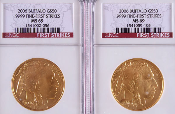 TWO 2006 AMERICAN GOLD BUFFALOS NGC MS69 "FIRST STRIKES". Each $50 coin 1 Troy oz. gold.