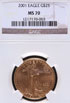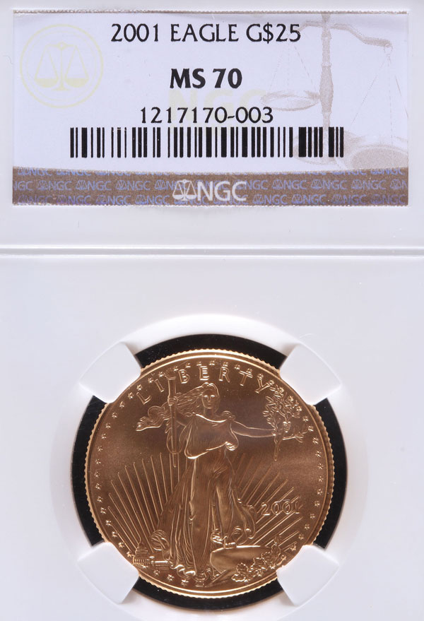A 2001 AMERICAN GOLD EAGLE NGC MS70. $25 gold coin, .5 Troy oz. gold.
