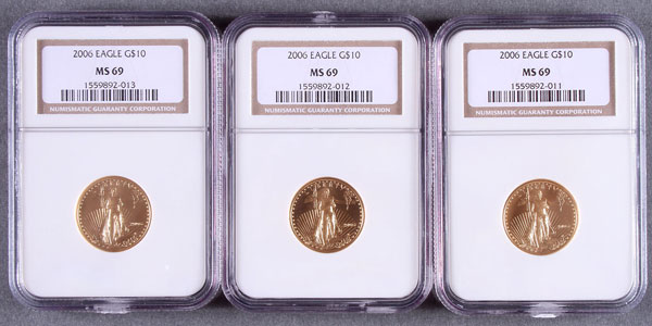 THREE 2006 AMERICAN GOLD EAGLES NGC MS69. Each $10 coin .25 Troy oz. gold.