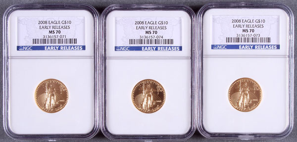 THREE 2008 AMERICAN GOLD EAGLES NGC MS70 "EARLY RELEASES". Each $10 coin .25 Troy oz. gold.