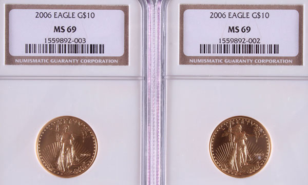 TWO 2006 AMERICAN GOLD EAGLES NGC MS69. Each $10 coin .25 Troy oz. gold.