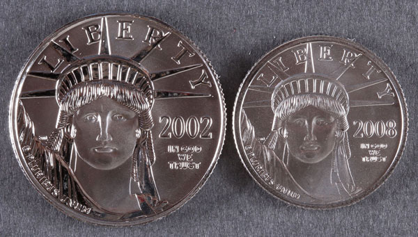 TWO AMERICAN PLATINUM EAGLES. Comprising a 2002 $50 and a 2008 $25, .75 Troy oz. total.