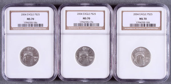 THREE 2004 AMERICAN PLATINUM EAGLES NGC MS70. Each coin $25, .75 Troy oz. total.