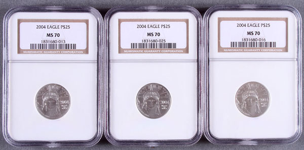 THREE 2004 AMERICAN PLATINUM EAGLES NGC MS70. Each coin $25, .75 Troy oz. total.