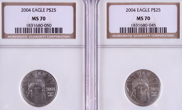 TWO 2004 AMERICAN PLATINUM EAGLES NGC MS70. Each coin $25, .5 Troy oz. total.