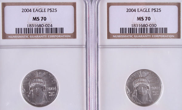 TWO 2004 AMERICAN PLATINUM EAGLES NGC MS70. Each coin $25, .5 Troy oz. total.