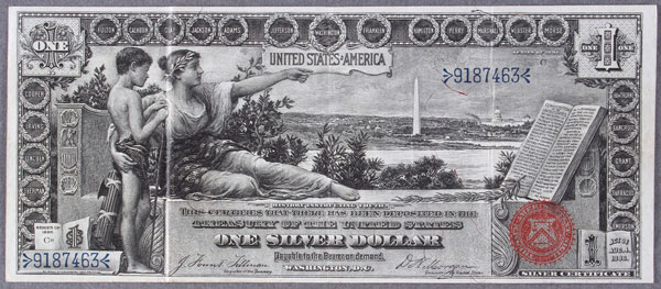 A U.S. ONE DOLLAR EDUCATIONAL NOTE. Silver certificate series 1896, Friedberg #224, first note in the Educational Series, depicting History instructing Youth with Constitution to the right, with the Washington Monument and Capitol in background surrounded by a border engraved with names of famous Americans within wreaths. Mostly very fine.