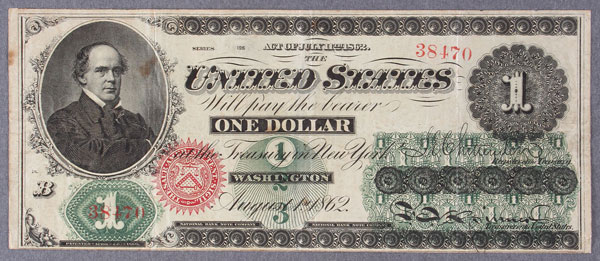 A U.S. ONE DOLLAR LEGAL TENDER NOTE. Second issue Series 1862, Friedberg #16, engraved with a portrait of Salmon Chase Secretary of the Treasury under Abraham Lincoln. Very good to fine.