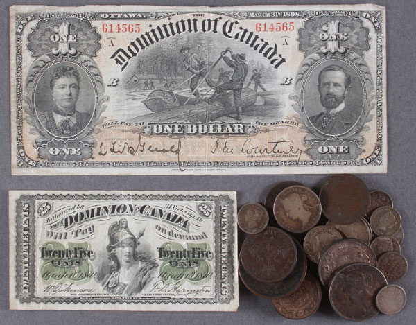 A CANADIAN CURRENCY AND COIN GROUP. Comprising a one dollar note, Ottawa, 1898; a 25 cent fractional note, Montreal and Ottawa, 1870; 1898 and 1916 halves; 1847, 1886, and 1919 quarters; six 5 cent pieces comprising 1870, 1881, 1892, 1896, 1897, 1899; an 1876 3 cent silver; 1884, 1887, and 1913 large cents; an 1842 bank token penny (Bank of Montreal); and 1850 and 1852 bank token half pennies (Bank of Upper Canada).