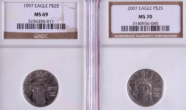 TWO AMERICAN PLATINUM EAGLES NGC MS69 AND MS70. Each $25 comprising one 1997 MS69 and one 2007 MS70, .5 Troy oz. total.