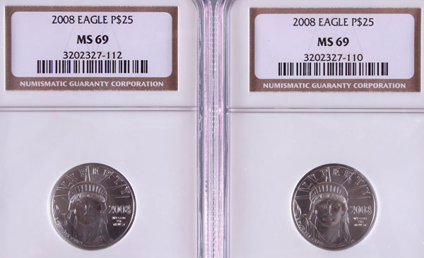 TWO 2008 AMERICAN PLATINUM EAGLES NGC MS69. Each coin $25, .5 Troy oz. total.