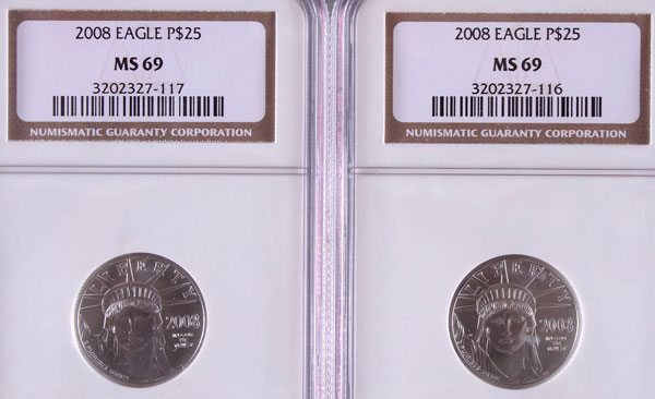 TWO 2008 AMERICAN PLATINUM EAGLES NGC MS69. Each coin $25, .5 Troy oz. total.