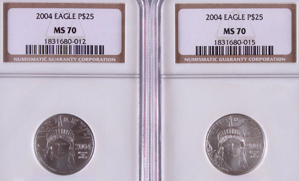 TWO 2004 AMERICAN PLATINUM EAGLES NGC MS70. Each coin $25, .5 Troy oz. total.