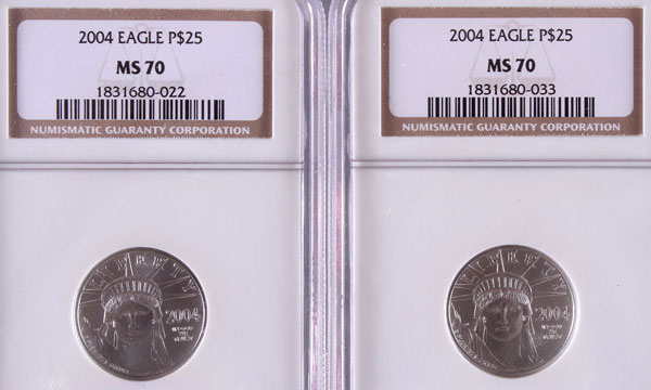 TWO 2004 AMERICAN PLATINUM EAGLES NGC MS70. Each coin $25, .5 Troy oz. total.