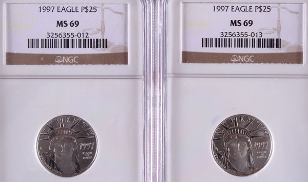 TWO 1997 AMERICAN PLATINUM EAGLES NGC MS69. Each coin $25, .5 Troy oz. total.