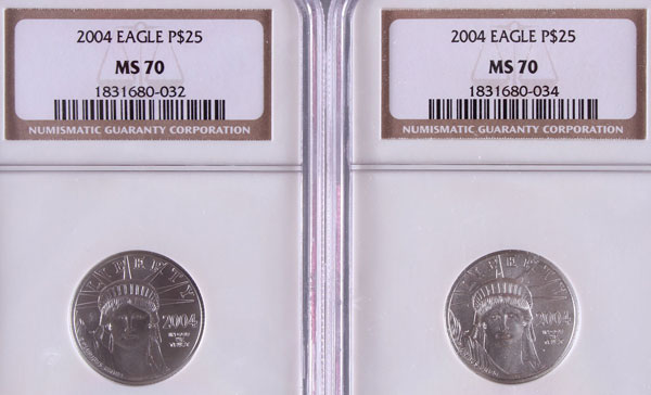 TWO 2004 AMERICAN PLATINUM EAGLES NGC MS70. Each coin $25, .5 Troy oz. total.