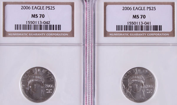 TWO 2006 AMERICAN PLATINUM EAGLES NGC MS70. Each coin $25, .5 Troy oz. total.