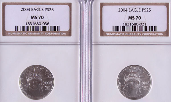 TWO 2004 AMERICAN PLATINUM EAGLES NGC MS70. Each coin $25, .5 Troy oz. total.