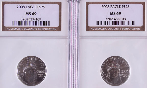 TWO 2008 AMERICAN PLATINUM EAGLES NGC MS69. Each coin $25, .5 Troy oz. total.