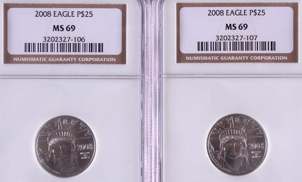 TWO 2008 AMERICAN PLATINUM EAGLES NGC MS69. Each coin $25, .5 Troy oz. total.