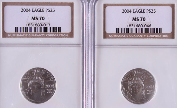 TWO 2004 AMERICAN PLATINUM EAGLES NGC MS70. Each coin $25, .5 Troy oz. total.
