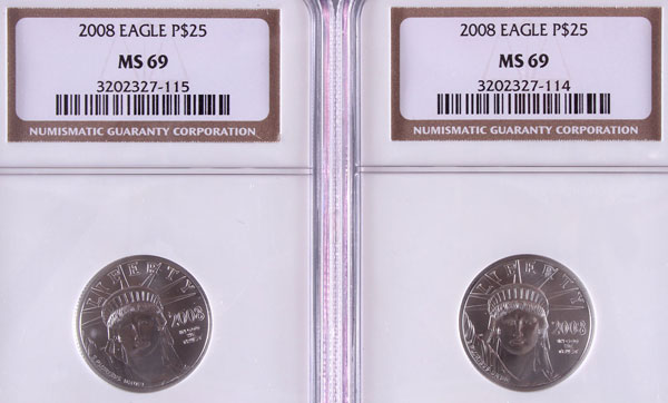 TWO 2008 AMERICAN PLATINUM EAGLES NGC MS69. Each coin $25, .5 Troy oz. total.
