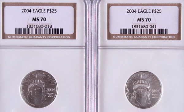 TWO 2004 AMERICAN PLATINUM EAGLES NGC MS70. Each coin $25, .5 Troy oz. total.