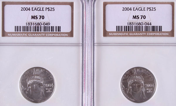 TWO 2004 AMERICAN PLATINUM EAGLES NGC MS70. Each coin $25, .5 Troy oz. total.
