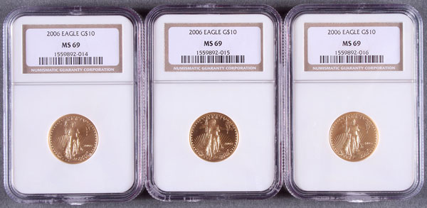 THREE 2006 AMERICAN GOLD EAGLES NGC MS69. Each coin $10, .75 Troy oz. total.
