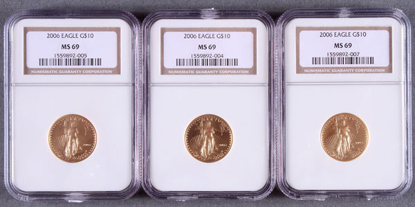 THREE 2006 AMERICAN GOLD EAGLES NGC MS69. Each coin $10, .75 Troy oz. total.