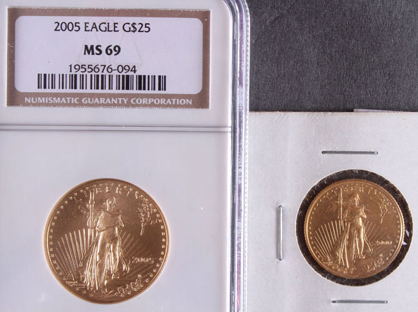 TWO AMERICAN GOLD EAGLES. Comprising a 2005 NGC MS69 $25 coin, and an uncirculated 2000 $10 coin. .75 Troy oz. total.