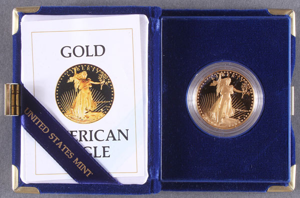A 1986 AMERICAN GOLD EAGLE PROOF. $50 1 Troy oz. gold coin, in original U.S. Mint blue velour case and box.