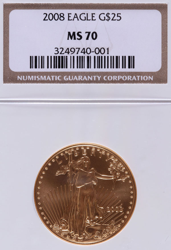 A 2008 AMERICAN GOLD EAGLE NGC MS70. $25 gold coin, .5 Troy oz.