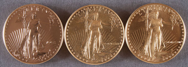 THREE AMERICAN GOLD EAGLES. Each $50 coin uncirculated, comprising one 1986, one 1987, and one 1998. 3 Troy oz. total.