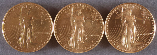 THREE AMERICAN GODL EAGLES. Each $50 coin uncirculated, comprising one 1986, one 1987, and one 1988. 3 Troy oz. total.