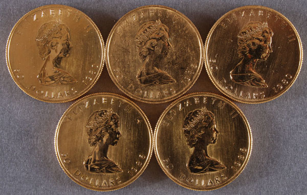 FIVE CANADIAN GOLD MAPLE LEAFS. All uncirculated $50 coins, comprising two 1980, one 1985, and two 1986. 5 Troy oz. total.