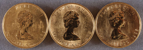 THREE 1985 CANADIAN GOLD MAPLE LEAFS. All uncirculated, $50 coins. 3 Troy oz. total.