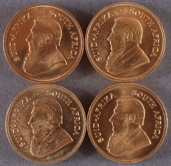 FOUR SOUTH AFRICAN GOLD KRUGGERANDS. Each 1 Troy oz., comprising one 1979, one 1981, one 1983, and one 1984.