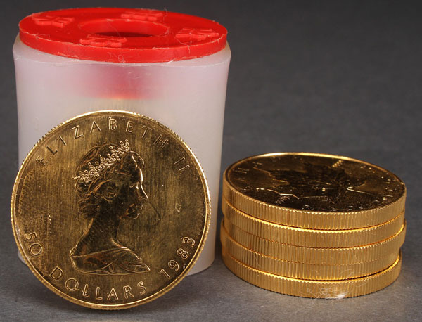 SIX 1983 CANADIAN GOLD MAPLE LEAFS. Each uncirculated $50 coin, 6 Troy oz. total.