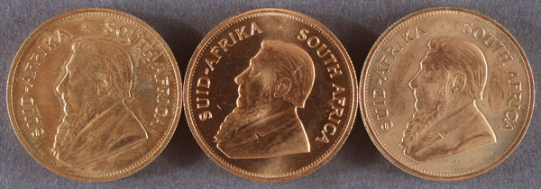 THREE SOUTH AFRICAN GOLD KRUGGERANDS. Each 1 Troy oz., comprising one 1980, one 1981, and one 1984.