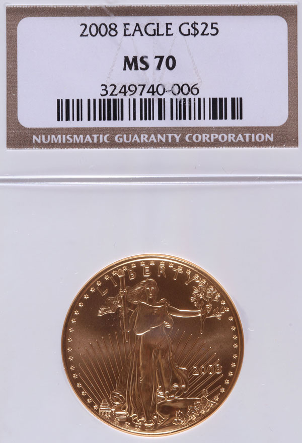 A 2008 AMERICAN GOLD EAGLE NGC MS70. $25 gold coin, .5 Troy oz.
