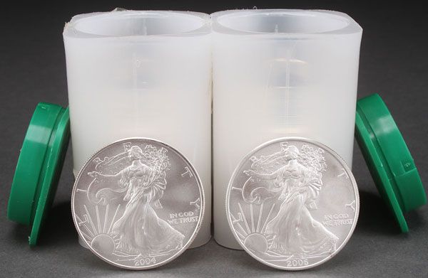 36 AMERICAN SILVER EAGLES. Comprising a partial roll of 18-2004 and a partial roll of 18-2006. All uncirculated, 1 Troy oz. each.