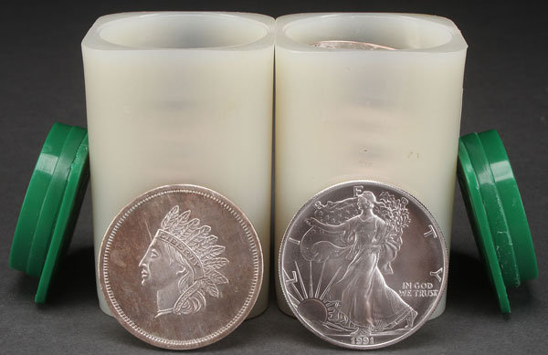TWO ROLLS OF AMERICAN SILVER EAGLES AND ONE OUNCE SILVER ROUNDS. Comprising 20 uncirculated 1991 silver Eagles, and 20 one ounce silver rounds with designs after U.S. Peace dollar and Indian Head cent.