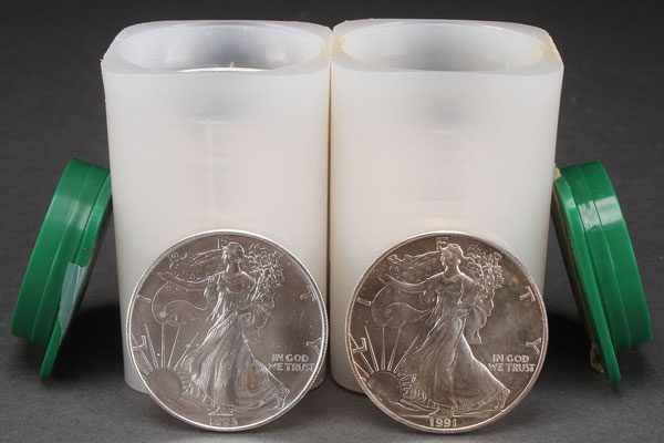 TWO ROLLS OF AMERICAN SILVER EAGLES. All uncirculated, comprising 20-1991 1 Troy oz. coins, and 20-1993 1 Troy oz. coins.