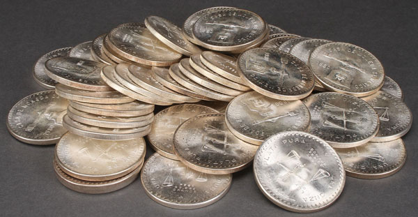 A GROUP OF 50 ONE OUNCE SILVER ROUNDS. Mostly Mexican una onza silver rounds 1978 and 1980, and some with designs after U.S. coins. 50 Troy oz. total.