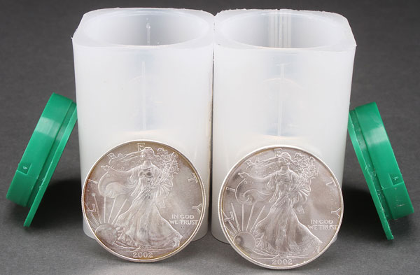 28 2002 AMERICAN SILVER EAGLES. All uncirculated, in two U.S. Mint containers. Each coin 1 Troy oz.