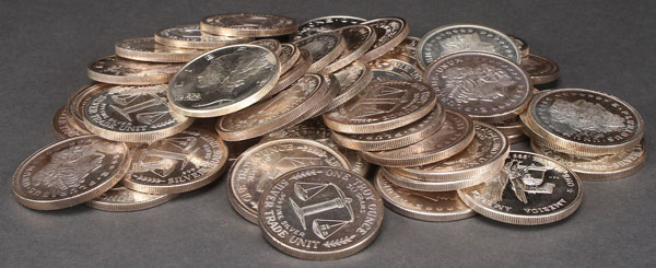 A GROUP OF 50 ONE OUNCE SILVER ROUNDS. Mixed designs after U.S. coins including Peace dollar, Morgan dollar, and Buffalo nickel. 50 Troy oz. total.