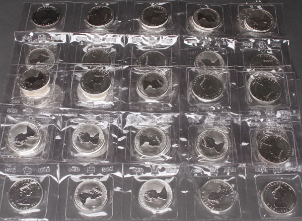 50-1989 CANADIAN SILVER MAPLE LEAFS. Contained in original bubble packs. 50 Troy oz. total.