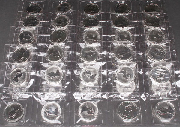 50-1989 CANADIAN SILVER MAPLE LEAFS. Contained in original bubble packs. 50 Troy oz. total.