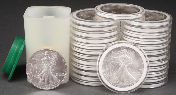 41 AMERICAN SILVER EAGLE $1 COINS. All uncirculated, comprising 15-1997, six 2002, and 20-2003 coins. 1 Troy oz. each.